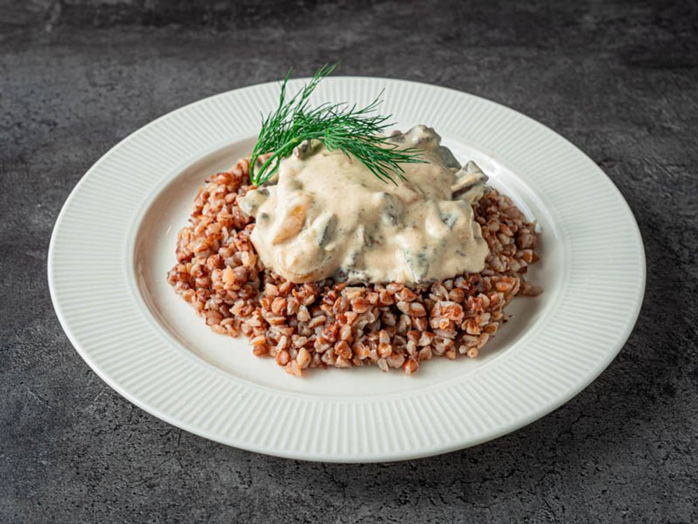 Печень по-строгановски, подаётся с гарниром на выбор с доставкой