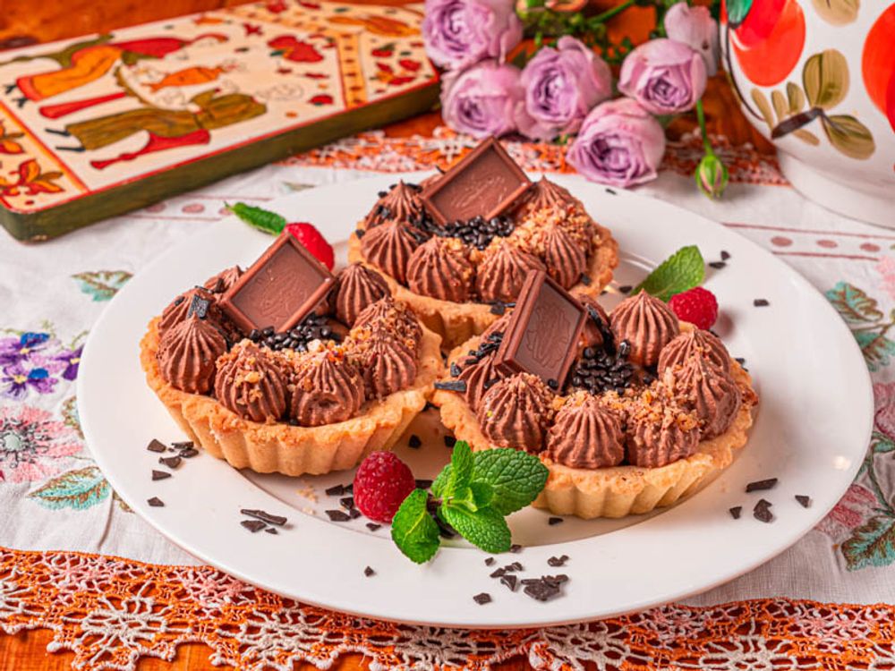 Классическая песочная корзинка, сливочный крем, шоколадный ганаш, малиновый конфитюр, шоколадный сливочный крем, украшена долькой молочного шоколада.
