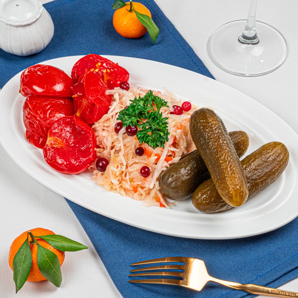 Квашенная капустка с клюквой нашего производства, бочковые огурчики и помидоры монастырского посола. Прекрасная закуска и украшение стола.