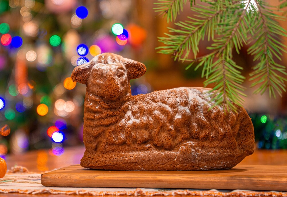 Рождественский Агнец из бисквитного теста по старинному рецепту. В составе только пшеничная мука высшего сорта, натуральное сливочное масло, отборные куриные яйца, коньяк и сахар.