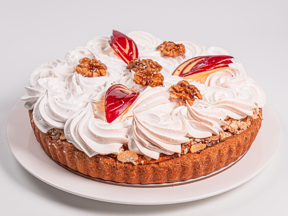 Богатый сезонный пирог со слоем карамелизированных и свежих яблок, заварным кремом, украшен взбитым белком, запеченным в меренгу и орехом