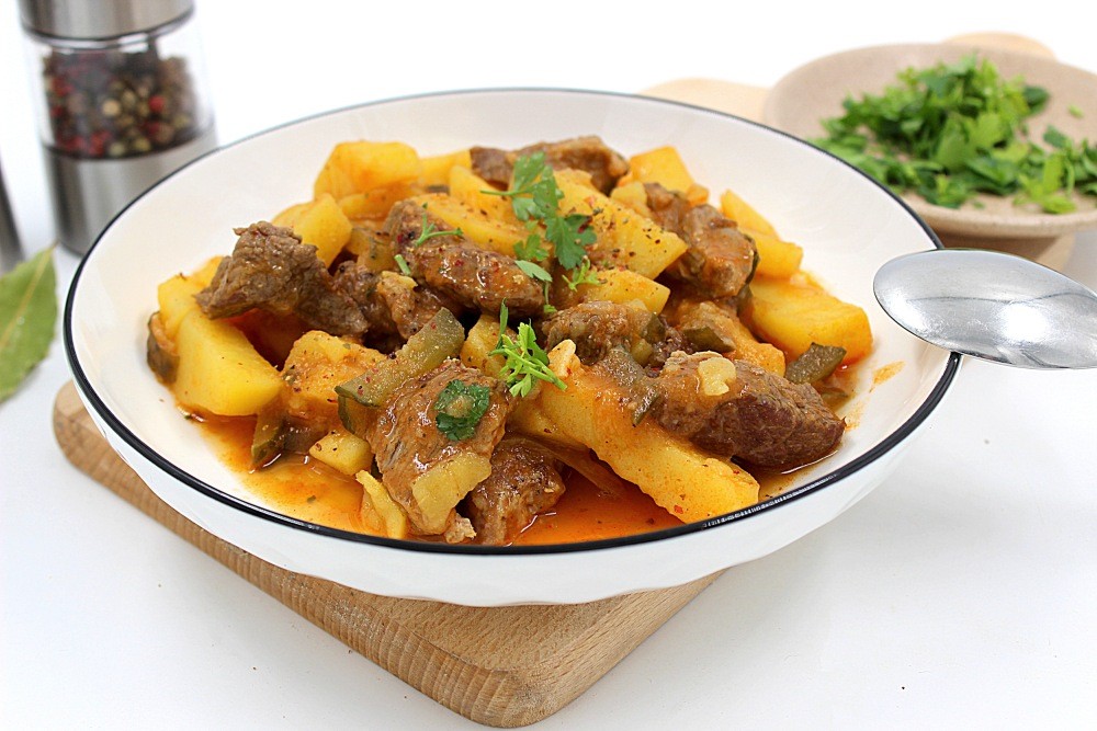 Азу из говядины с луком и овощами, подаётся с гарниром на выбор с доставкой