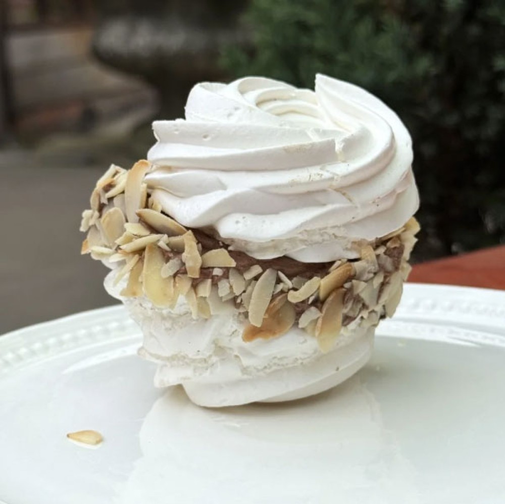 Хрустящее воздушное безе с нежным шоколадным кремом, украшенное золотистыми миндальными лепестками. Идеальный баланс сладости и текстур для настоящих сладкоежек