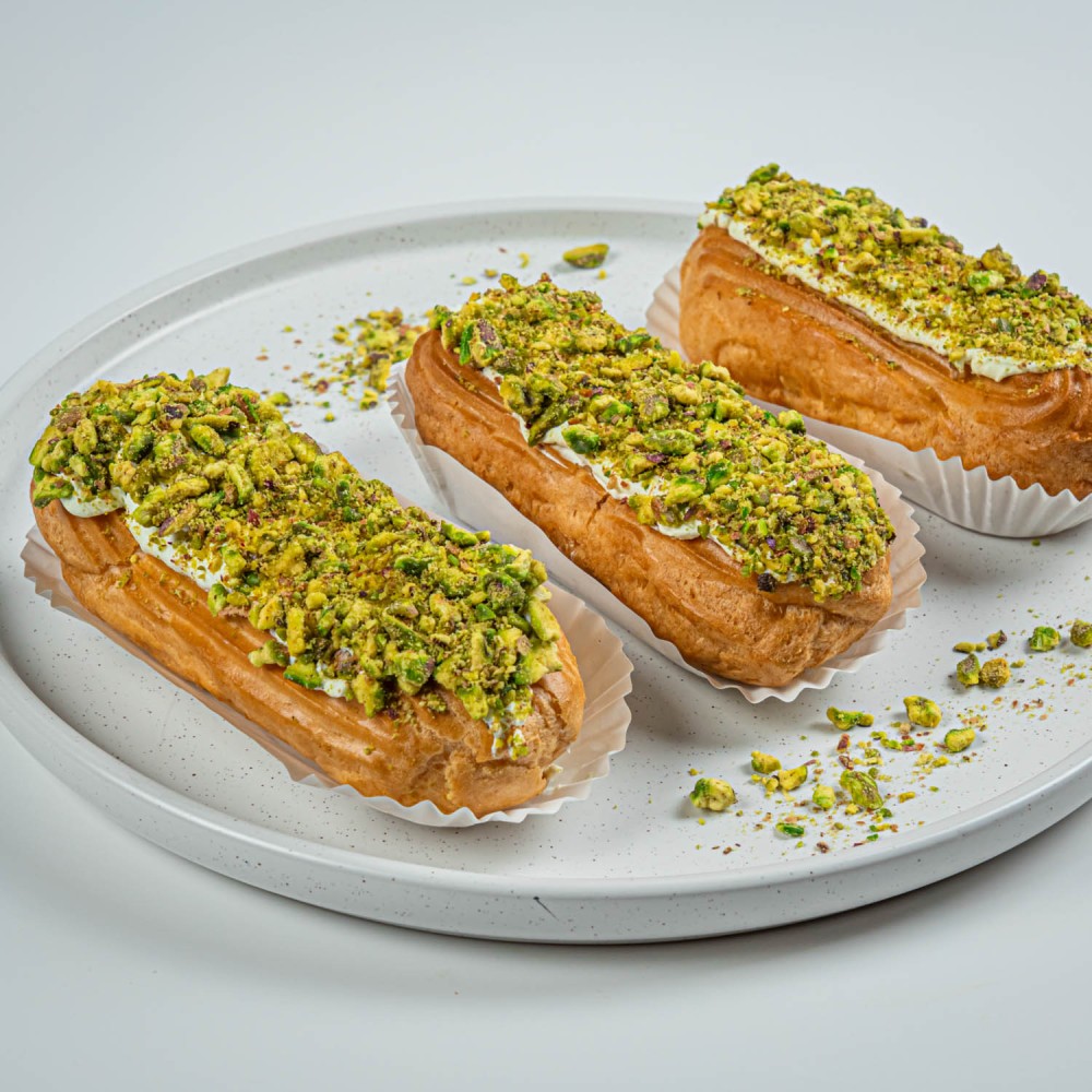 Хрустящее заварное тесто, крем сливочно-заварной, с добавлением натуральной фисташковой пасты. Сверху эклеры украшены молотым фисташковым орехом.