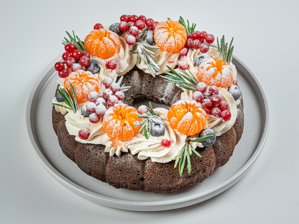Роскошный кекс, богато наполненный курагой, грецкими орехами, изюмом, черносливом и цукатами, в нежном тесте испеченном на сливочном масле, с добавлением коньяка. Настоящее угощение и украшение вашего праздника. Кекс украшен дольками мандаринов, черникой, веточками розмарина и нежным сливочным кремом.