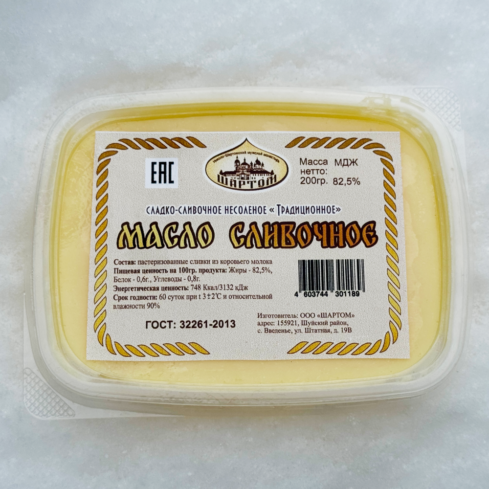 Масло сливочное натуральное 82,5% жирность. Производитель "Николо-Шартомский монастырь"