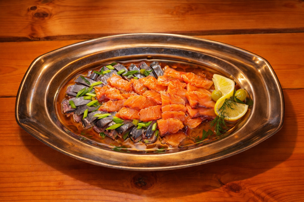 Щедрая порция двух классических закусок (по 200 гр каждая), приготовленных по нашему рецепту. Бархатистая семга и насыщенная сельдь — наш фирменный посол раскрывает лучшие качества и характер каждой рыбки. Подаётся со свежим зелёным луком и лимоном для яркого акцента.