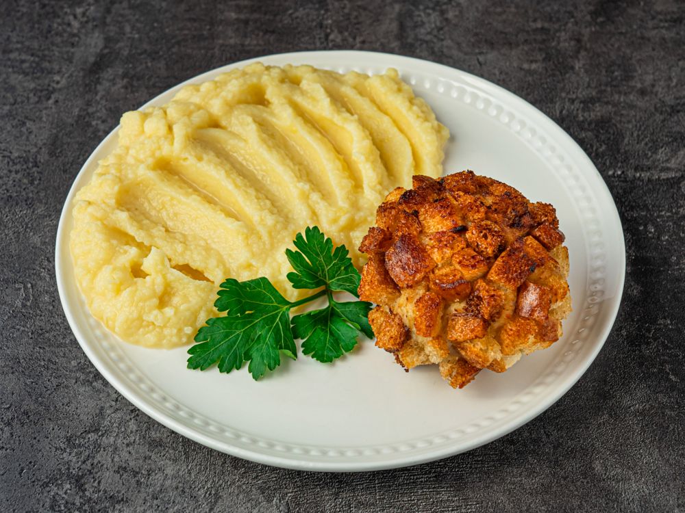 Нежнейшая котлета из куриного филе на сливках и сливочном масле, с хрустящей корочкой из сухариков. Внутри — сочная, воздушная, буквально тает. Подаём с гарниром на ваш выбор: гречка, спагетти, картофельное пюре, капуста тушеная.