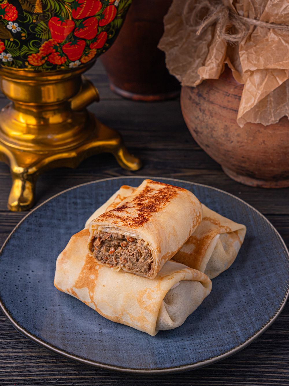 Тонкие блинчики, фаршированные говяжьей печенью, тушёной с морковью и жареным луком. Подаём со сметаной. Вкусно, сытно и с пользой.