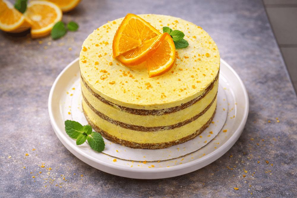 Нежные бисквитные коржи на апельсиновом соке с добавлением цедры, прослоенные воздушным кремом из растительных сливок и мангового сиропа. Внутри каждого кусочка — сочные дольки консервированного манго. Полностью растительный состав, яркий фруктовый вкус и летнее настроение круглый год.