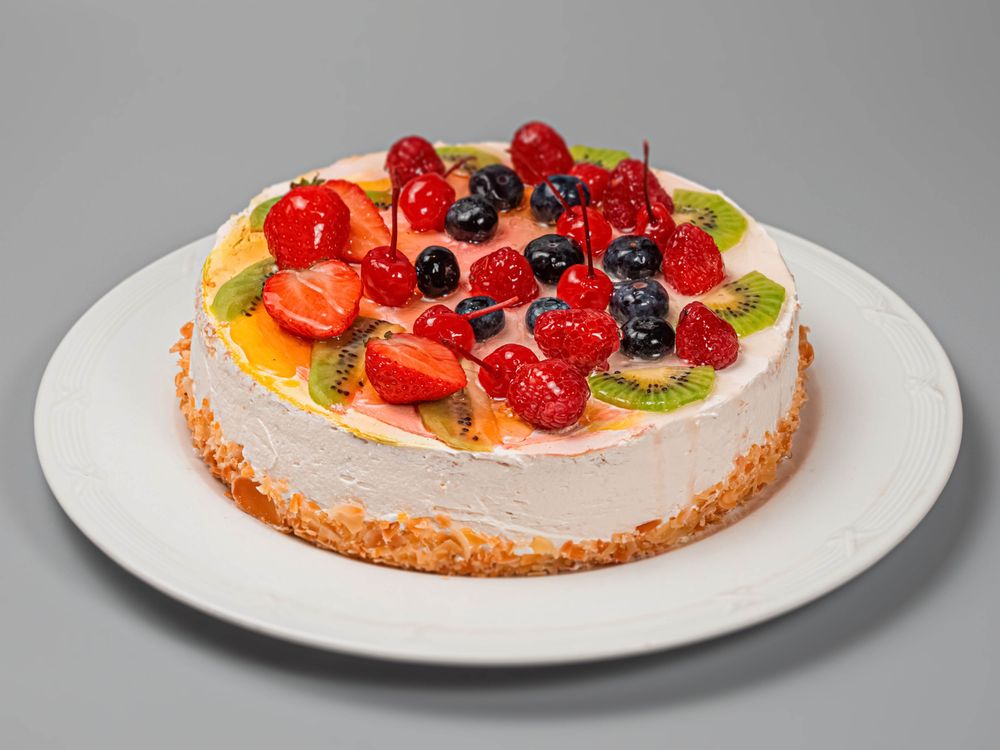 Украшение: фрукты свежие (клубника, голубика, киви, мандарины).