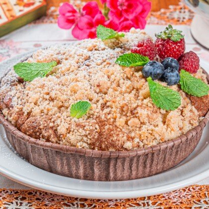 Нежный пирог приготовлен вручную исключительно из натуральных ингредиентов. Рассыпчатое песочное тесто на сметане и нежная сметанная начинка, напоминающая суфле. Божественно вкусный пирог!