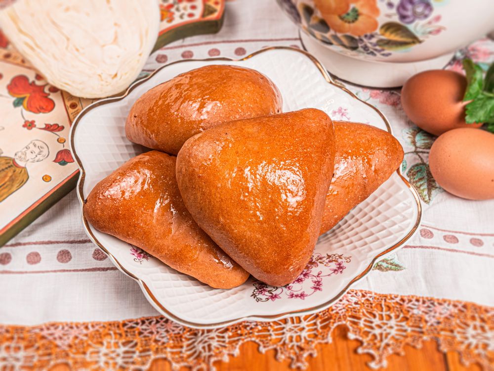 Состав: тесто (мука высшего сорта, сахар, вода питьевая, хлебопекарные дрожжи, масло подсолнечное, соль пищевая), начинка (капуста белокочанная, морковь, куриное яйцо С0, соль пищевая, перец черный молотый, масло подсолнечное)