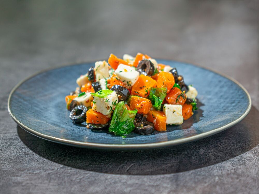 Состав: запеченная кубиками тыква, сыр Фета, листья Айсберга, маслины, и авторская заправка: дижонская горчица, лимонный сок, оливковое масло, соль и сахар.