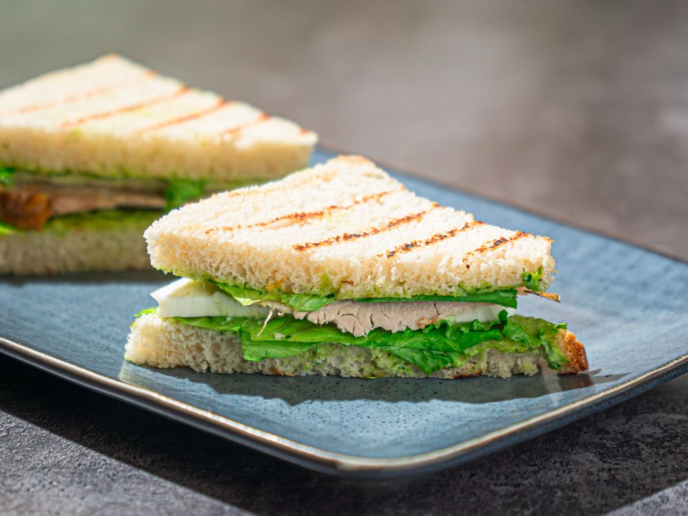 Сэндвичи с сыром, листьями салат Айсберг, ветчиной и авторской заправкой.
