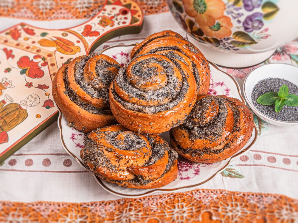 Мягкая маковая булочка пропитана сладким сиропом и с сочным маком внутри, понравится всем сладкоежкам.