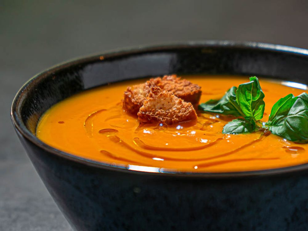 Прекрасный и изысканный крем-суп тыквенный, полезный и вкусный суп сваренный из спелой тыквы, в составе также немного моркови, обжаренный лук и оливковое масло