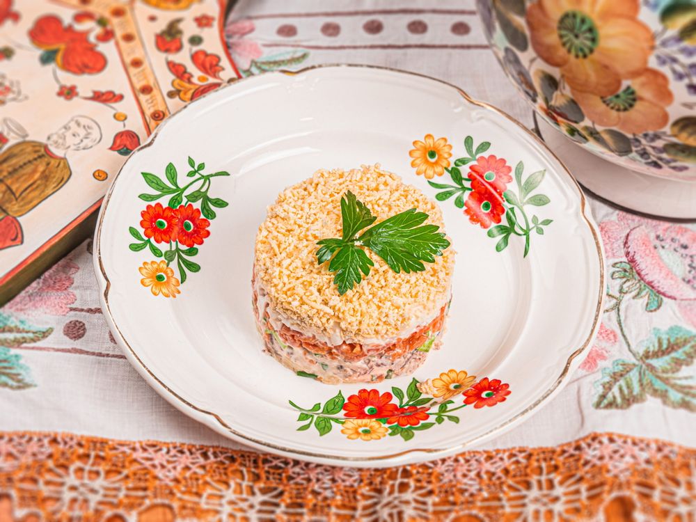 Состав: картофель, морковь, яйцо отварные, рыбная консерва в масле, лук зеленый, соль, майонез.