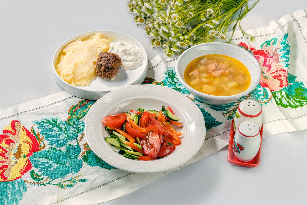 Суп с красной рыбой 350 гр Салат овощной заправленный маслом или сметаной 150 гр Мясная котлета подается со сливочно-грибным соусом и картофельным пюре 300 гр