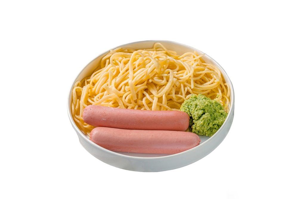 Вкуснейшее спагетти из твердых сортов пшеницы, с нежнейшими сосисками из телятины. Подаются с авторским соусом из майонеза, зелени, с добавлением чесночка.