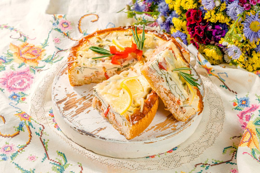 Открытый пирог из песочно-дрожжевого теста с начинкой из лосося, с добавлением шпината и помидора черри, заливается сливками, сверху посыпается сыром и украшается веточками розмарина с долькой лимона