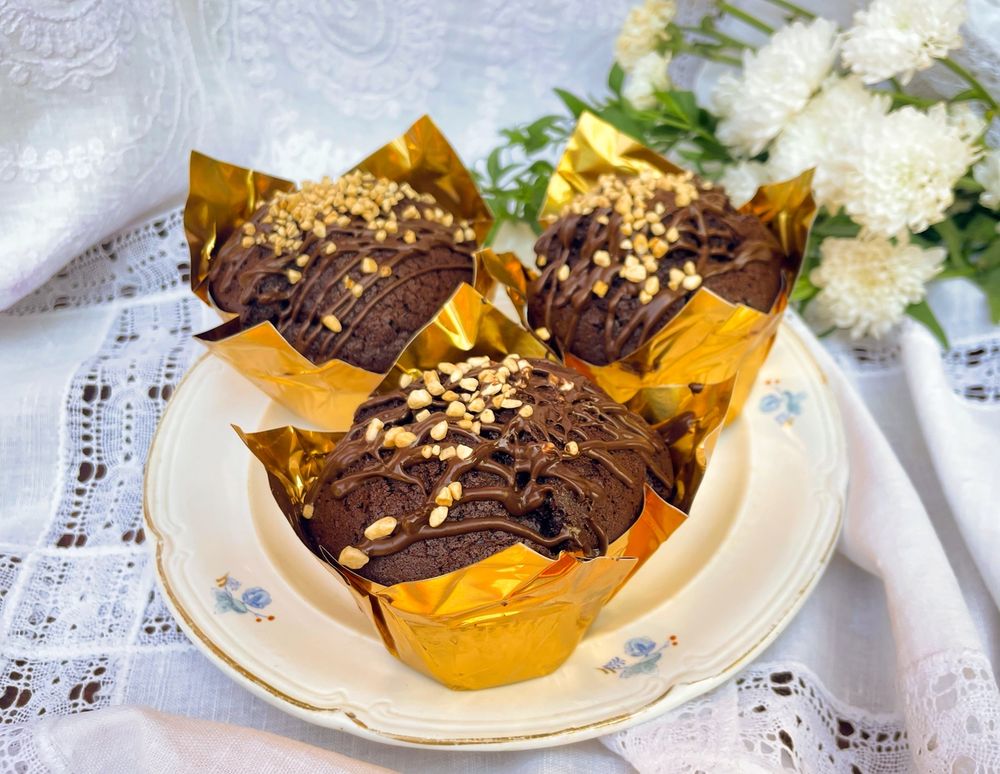 Шоколадный маффин, в составе теста: какао, шоколад, спелая вишня, маффин богато украшен воздушным рисом и шоколадной глазурью, золотая упаковка делает его украшением любого праздника.