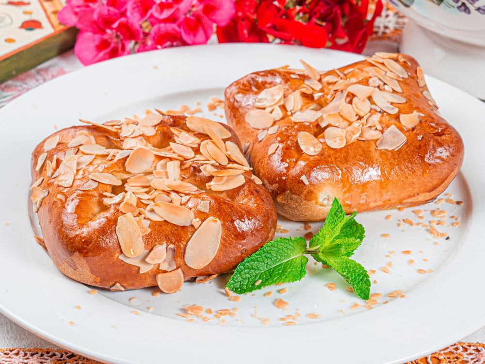 Булочка с воздушным тестом и нежной творожно - лимонной начинкой, присыпана лепестками миндаля.